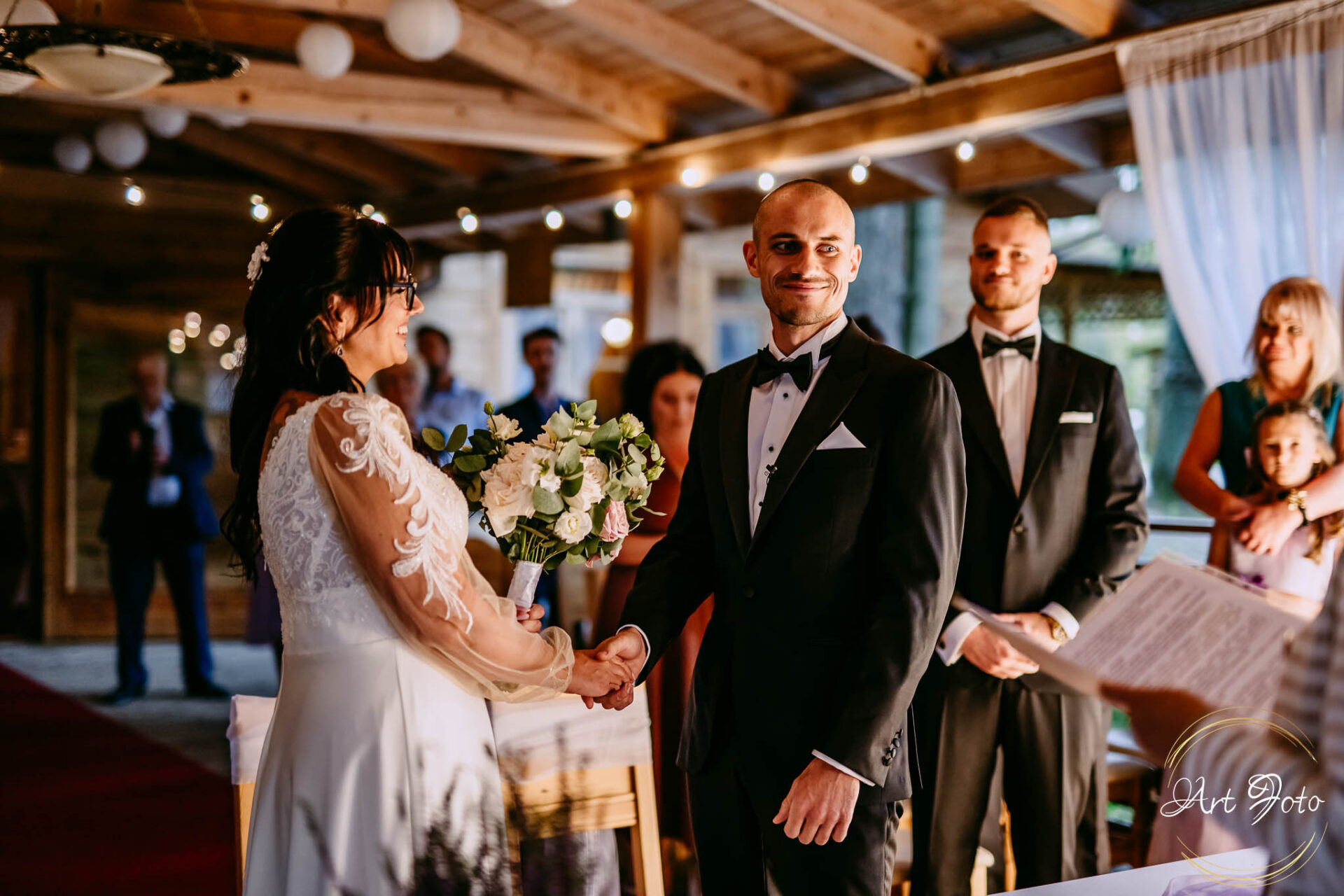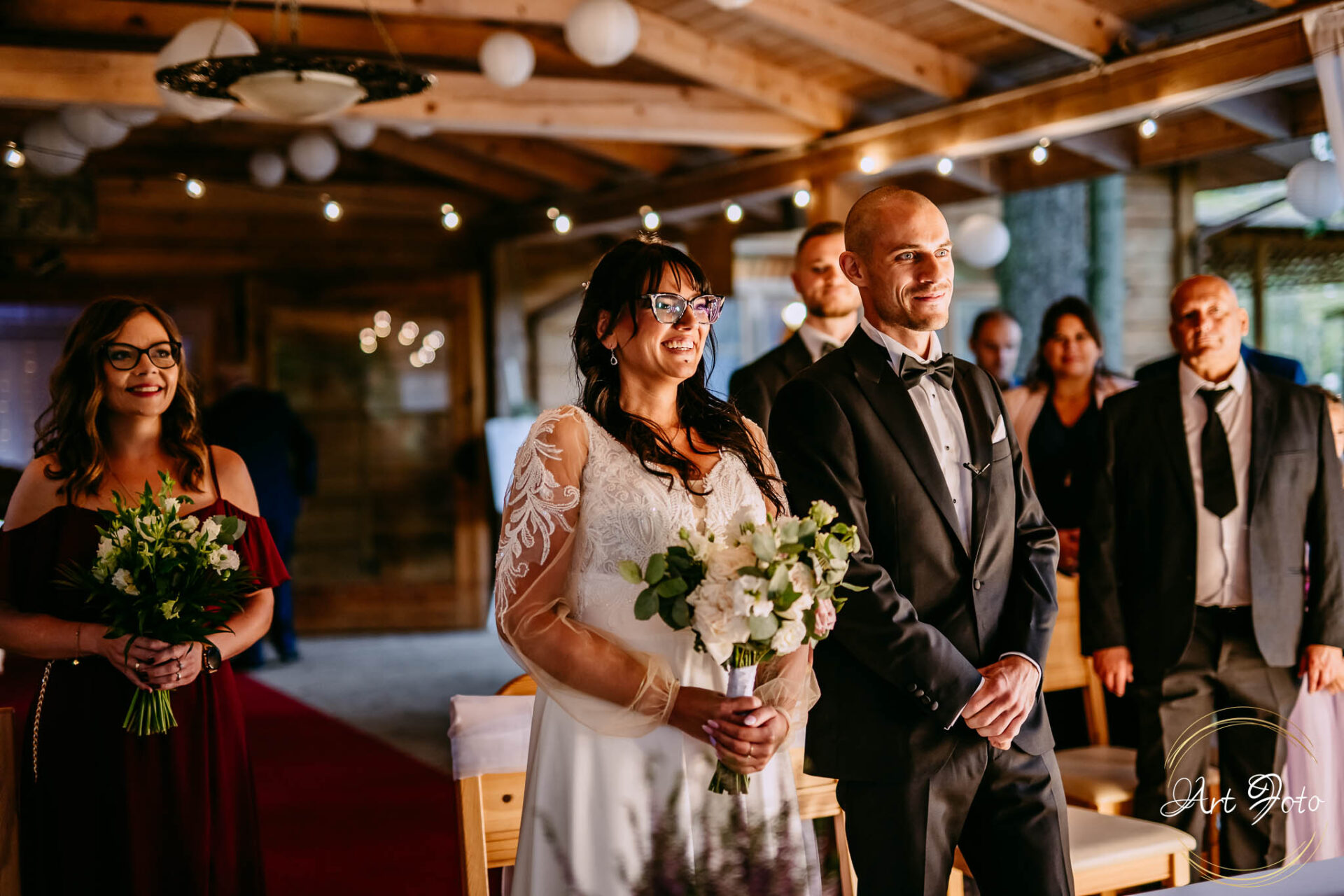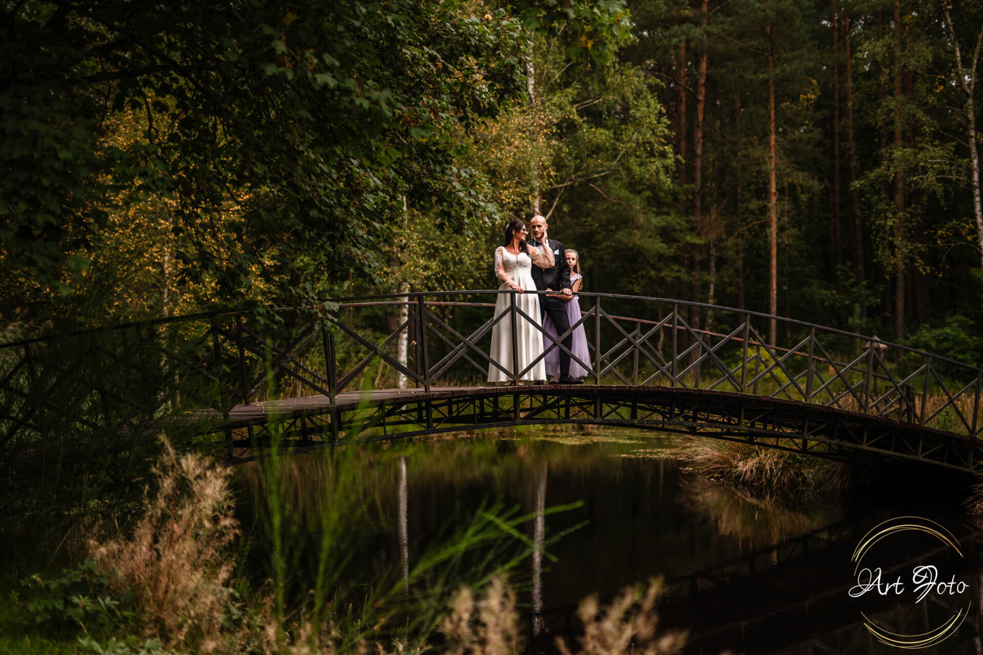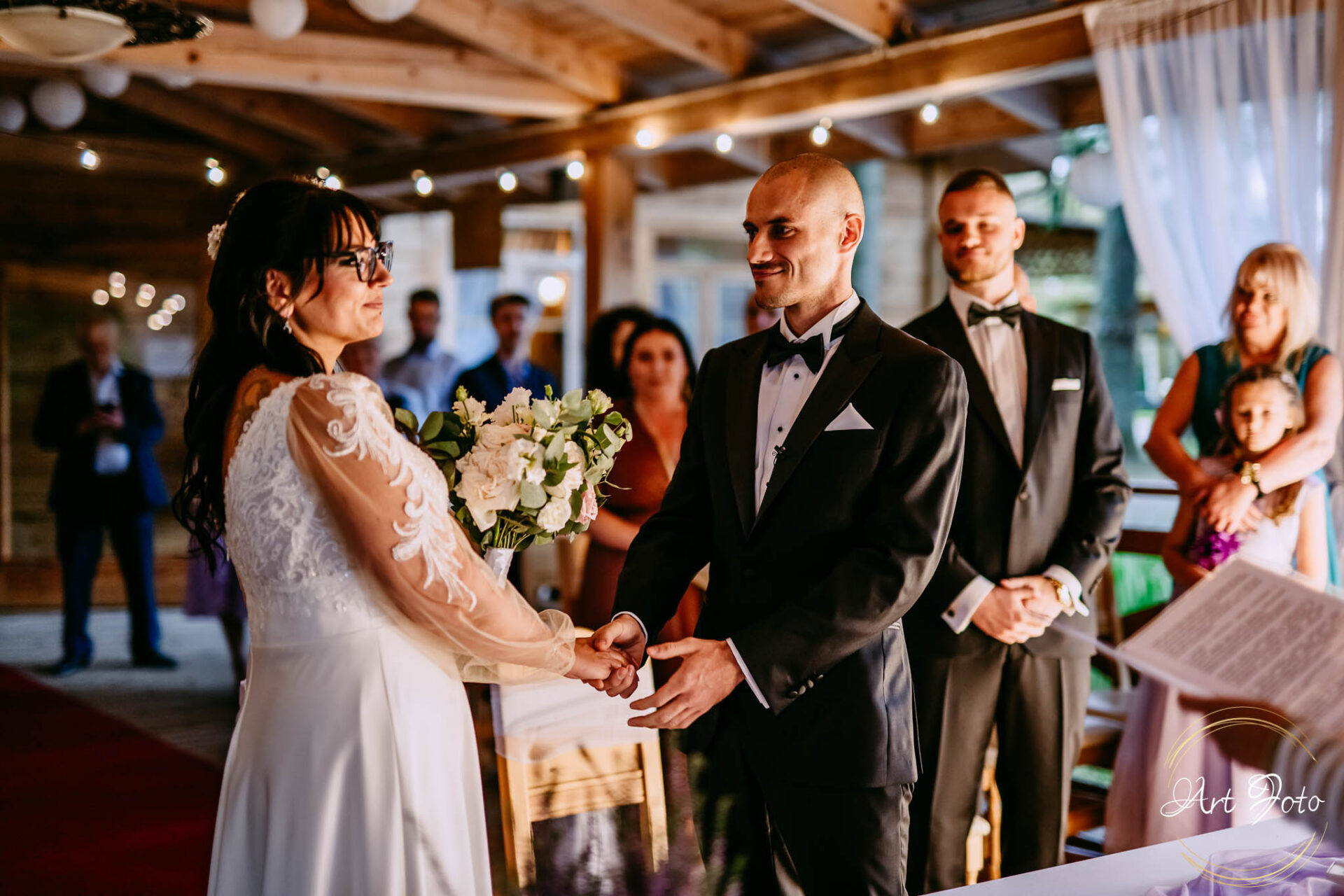 Ceremonia na drewnianym pomoście, otoczonym zielenią lasu, to coś absolutnie wyjątkowego. Para Młoda stoi nad wodą, a wokół nich najbliżsi – w ciszy, która potrafi być głośniejsza niż najpiękniejsza muzyka.