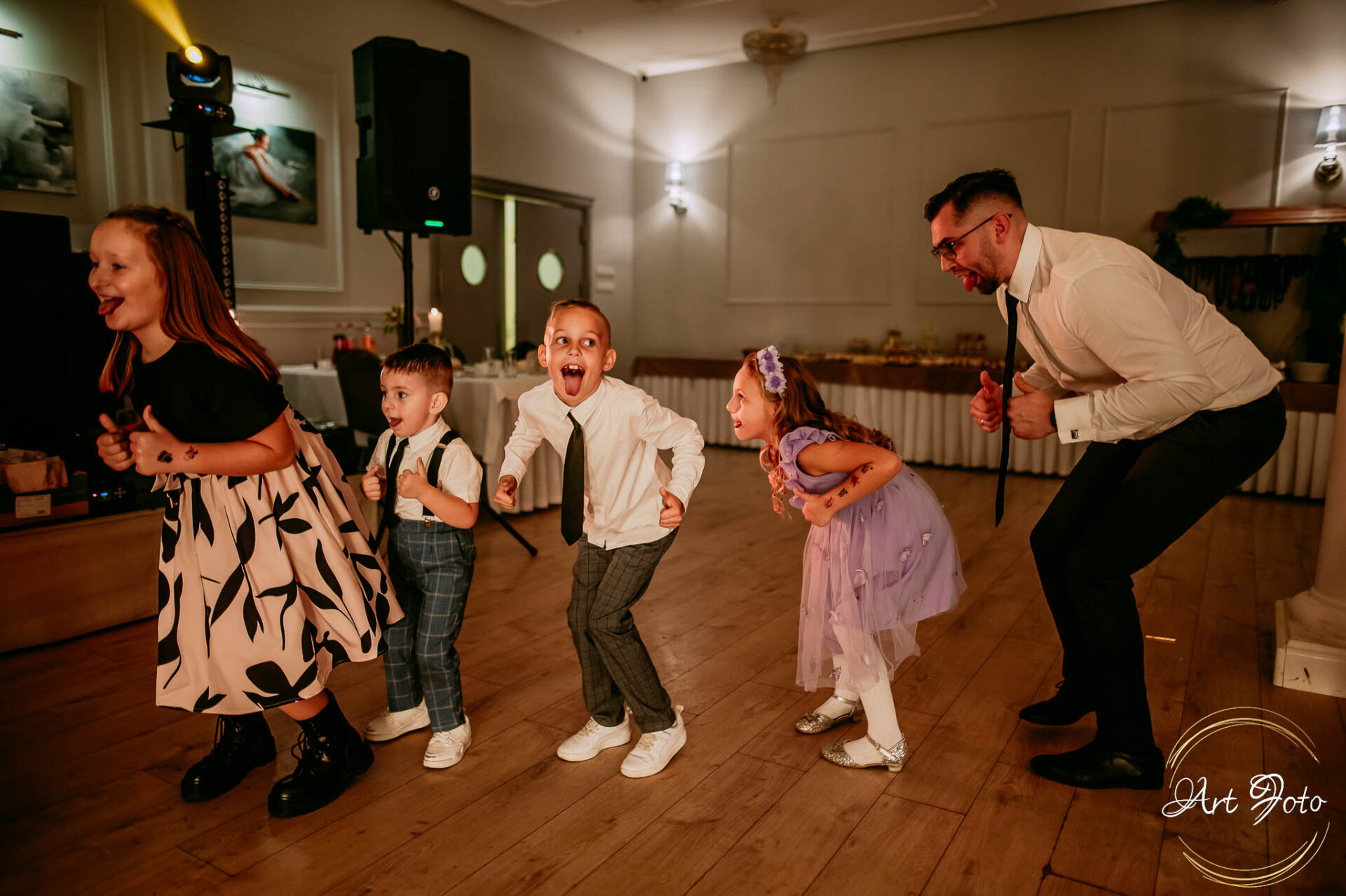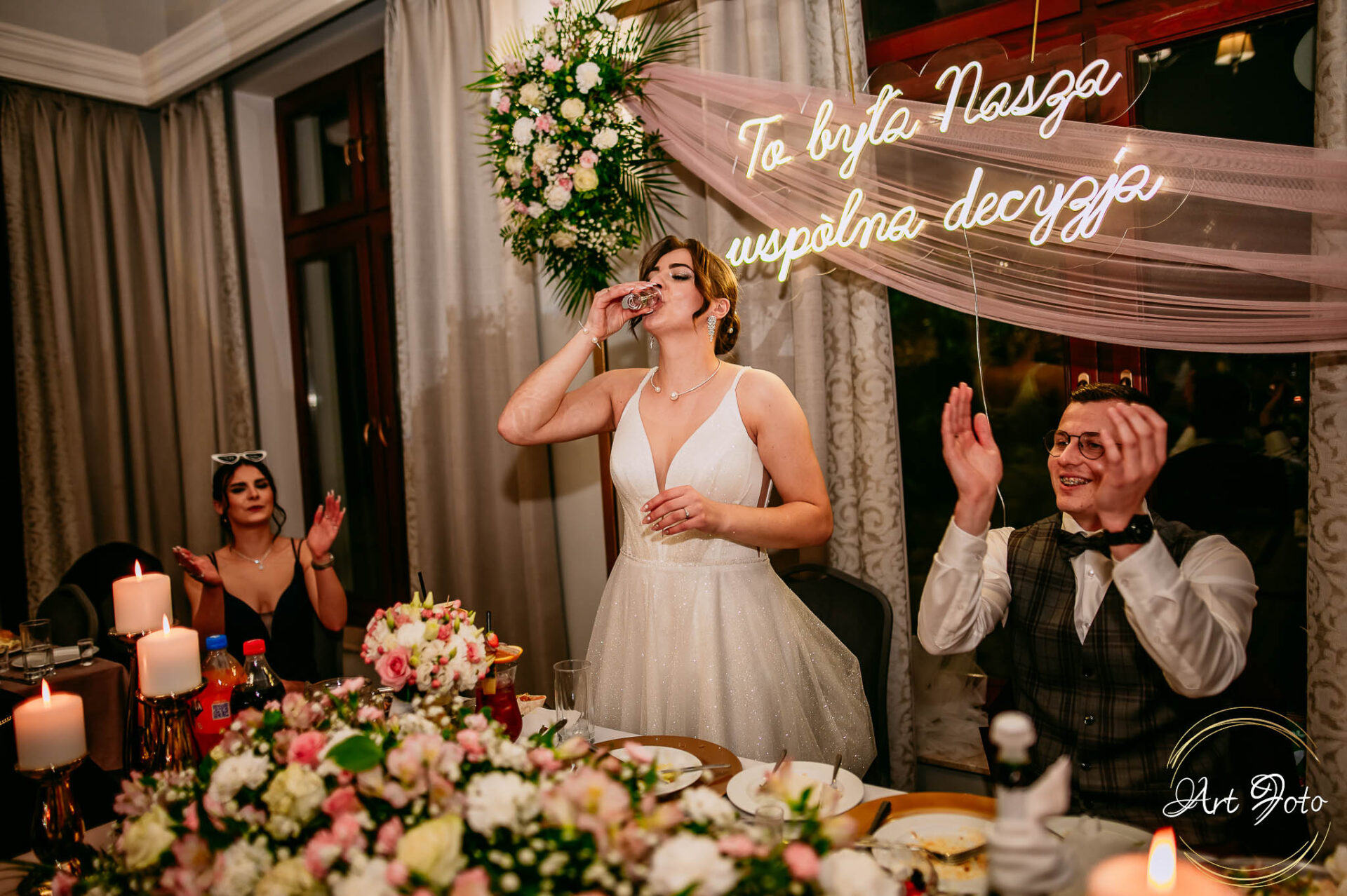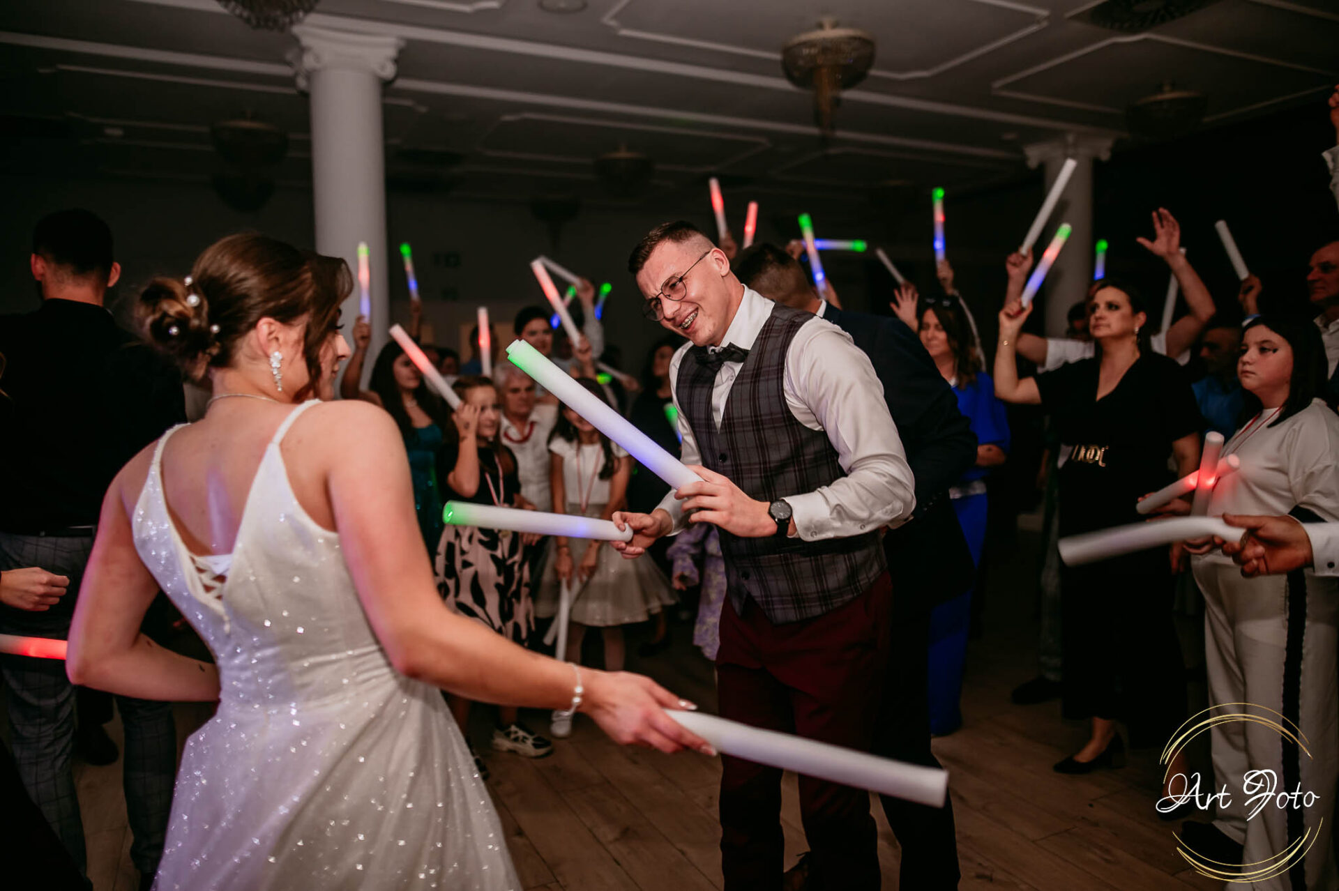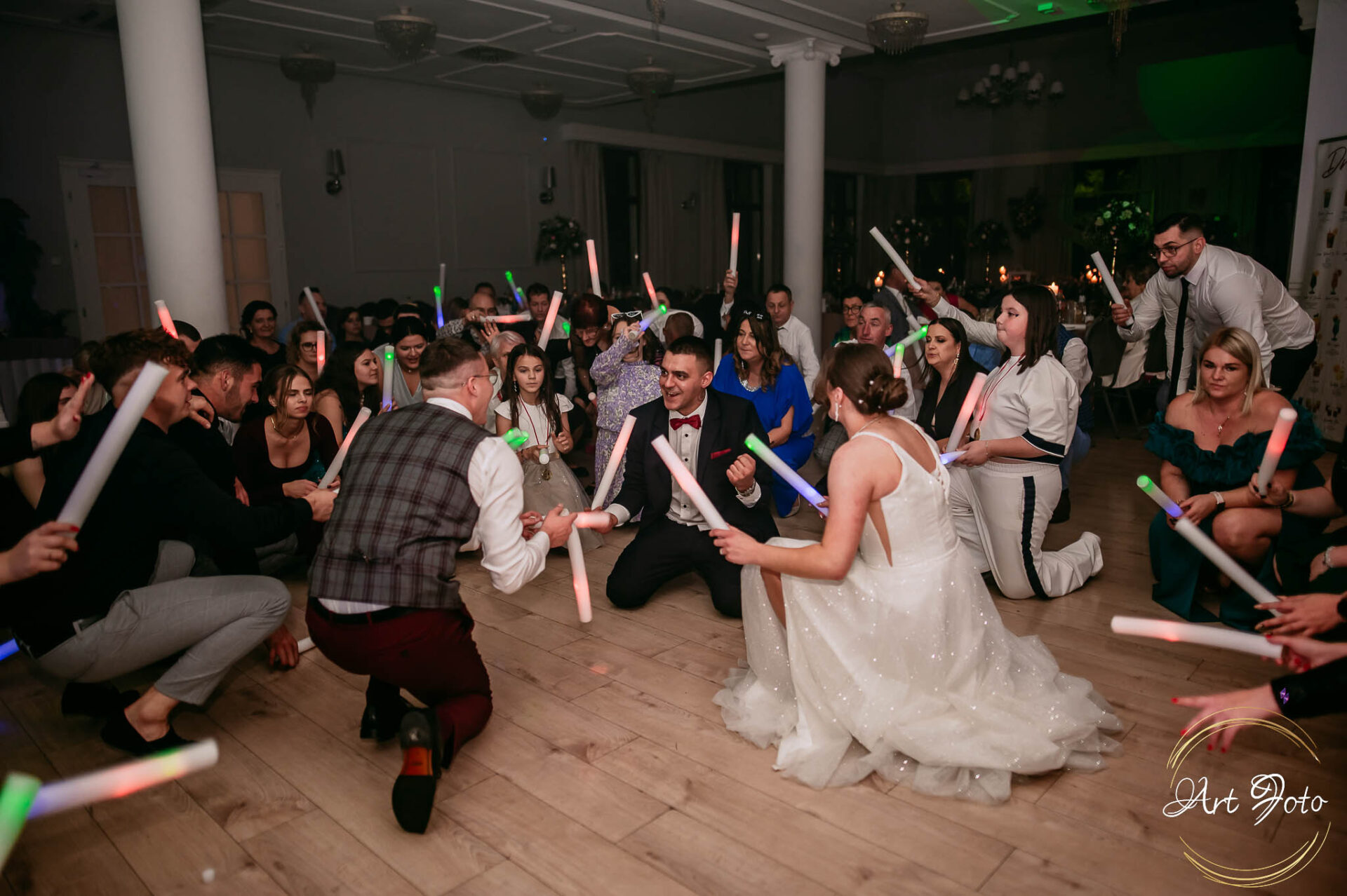 Po oficjalnej części przyszedł czas na prawdziwe świętowanie! Szaleństwo na parkiecie, wspólne przyśpiewki, oczepiny, a ja – niczym żywa fotobudka – łapałam w kadrach szczere uśmiechy, szalone układy taneczne i spontaniczne chwile radości. Bo przecież to właśnie one sprawiają, że wesele zostaje w pamięci na długo.