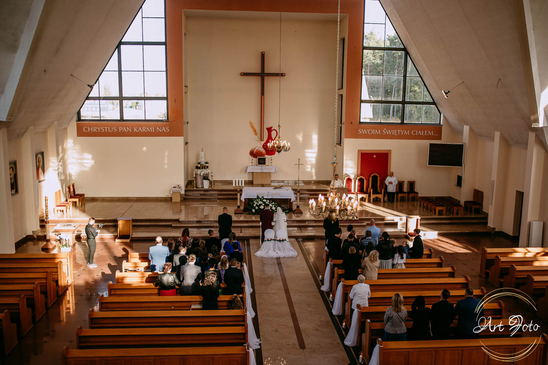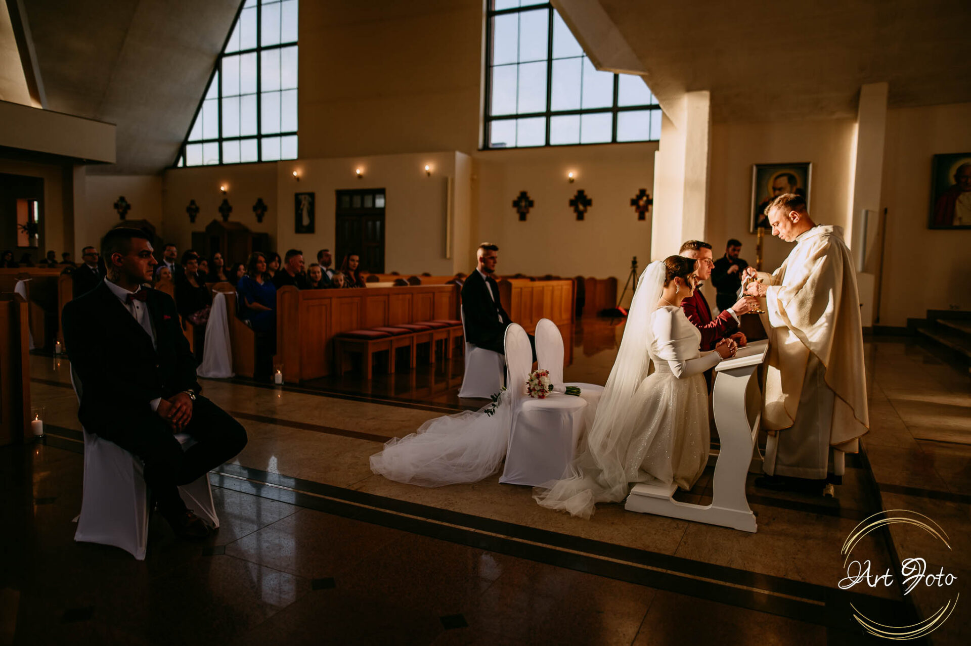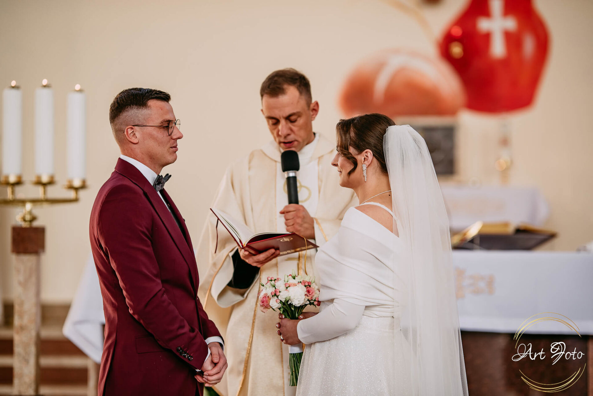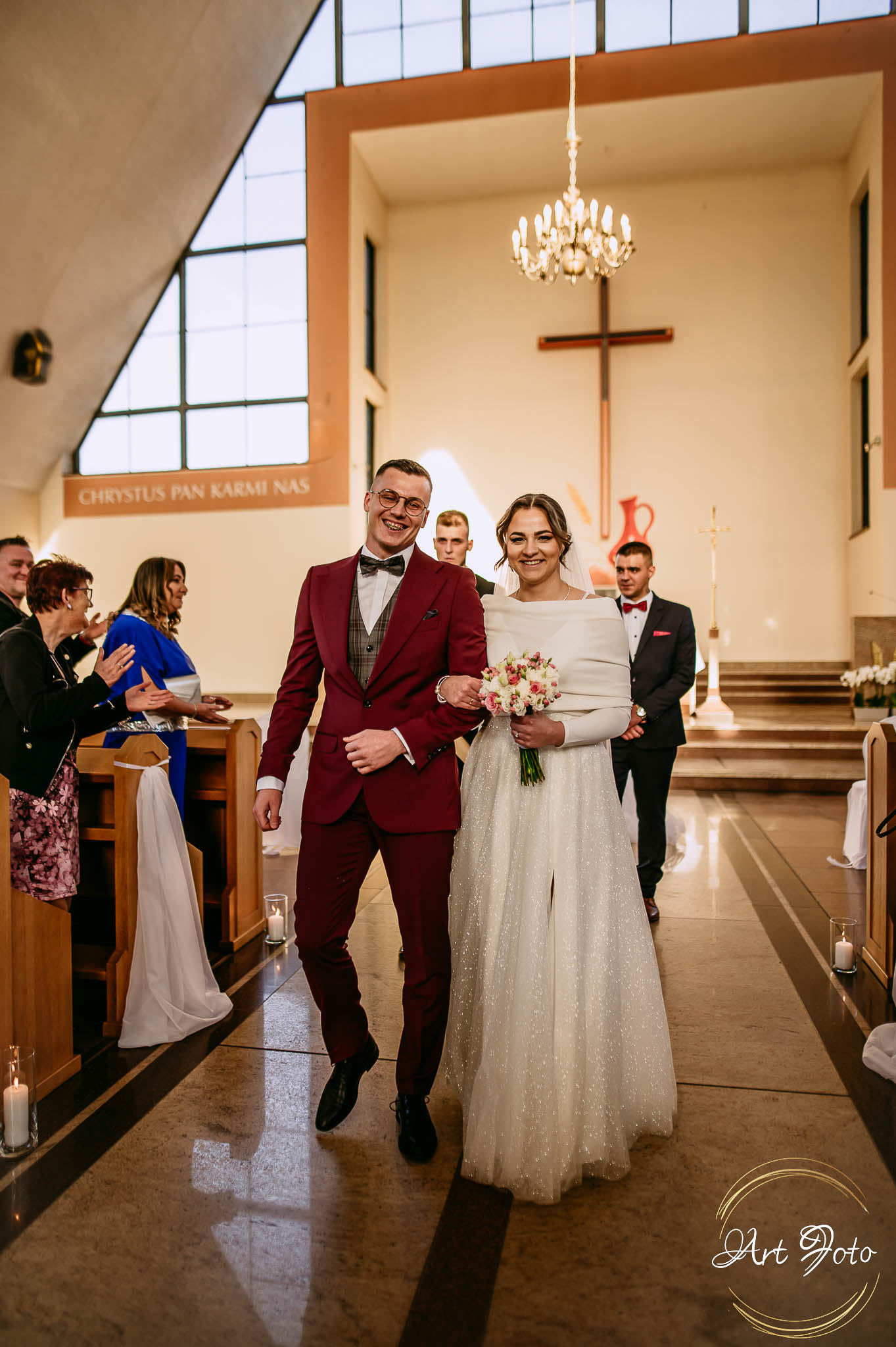 A później… ceremonia w kościele, gdzie gra światła dodatkowo dodawała magii i ważności tej chwili. Dźwięk przysięgi, subtelny uśmiech Patrycji, czuły dotyk dłoni Mateusza – momenty, które pozostaną z nimi na zawsze.